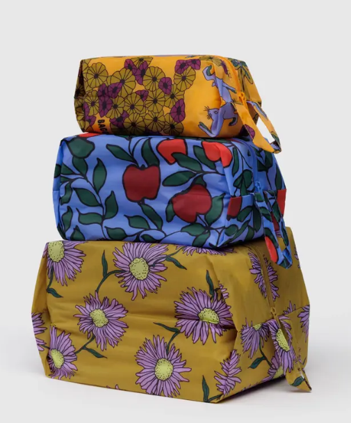 A set of three zippered pouches for travel and organization, with loops for carrying and hanging on the go. Perfect for packing, organizing your bag, or home tidying.