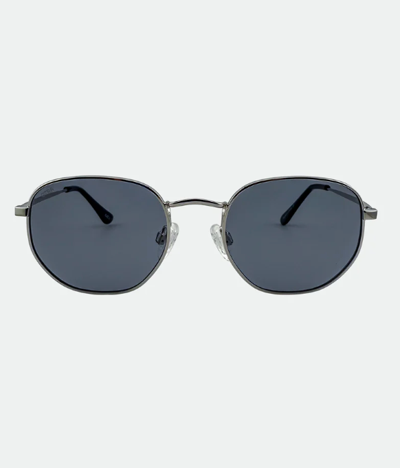 A sleek hexagonal-shaped metal frame in polished silver, offering a modern twist on a classic design. The smoke lenses add a cool understated edge, balancing sophistication with contemporary style.